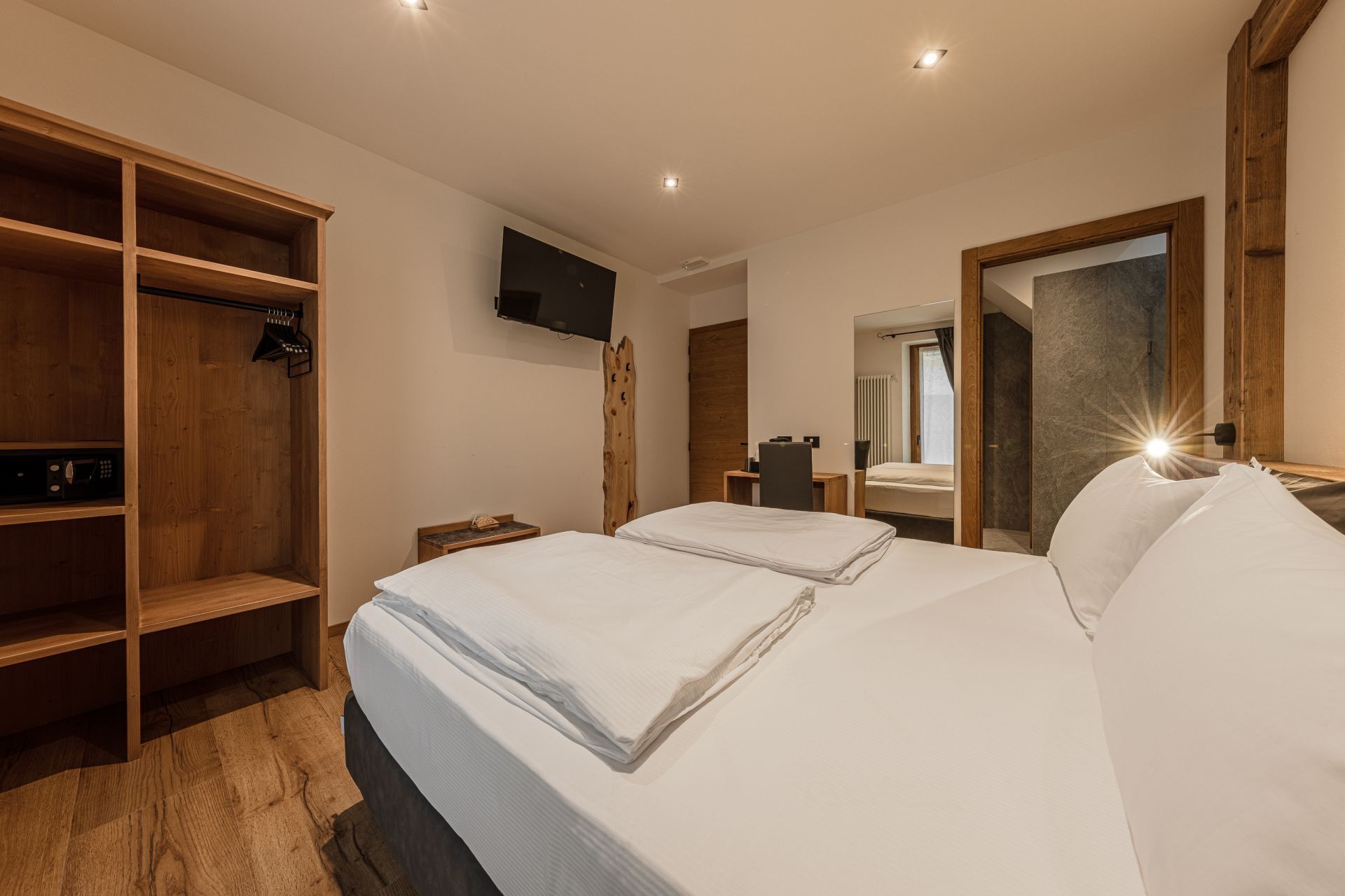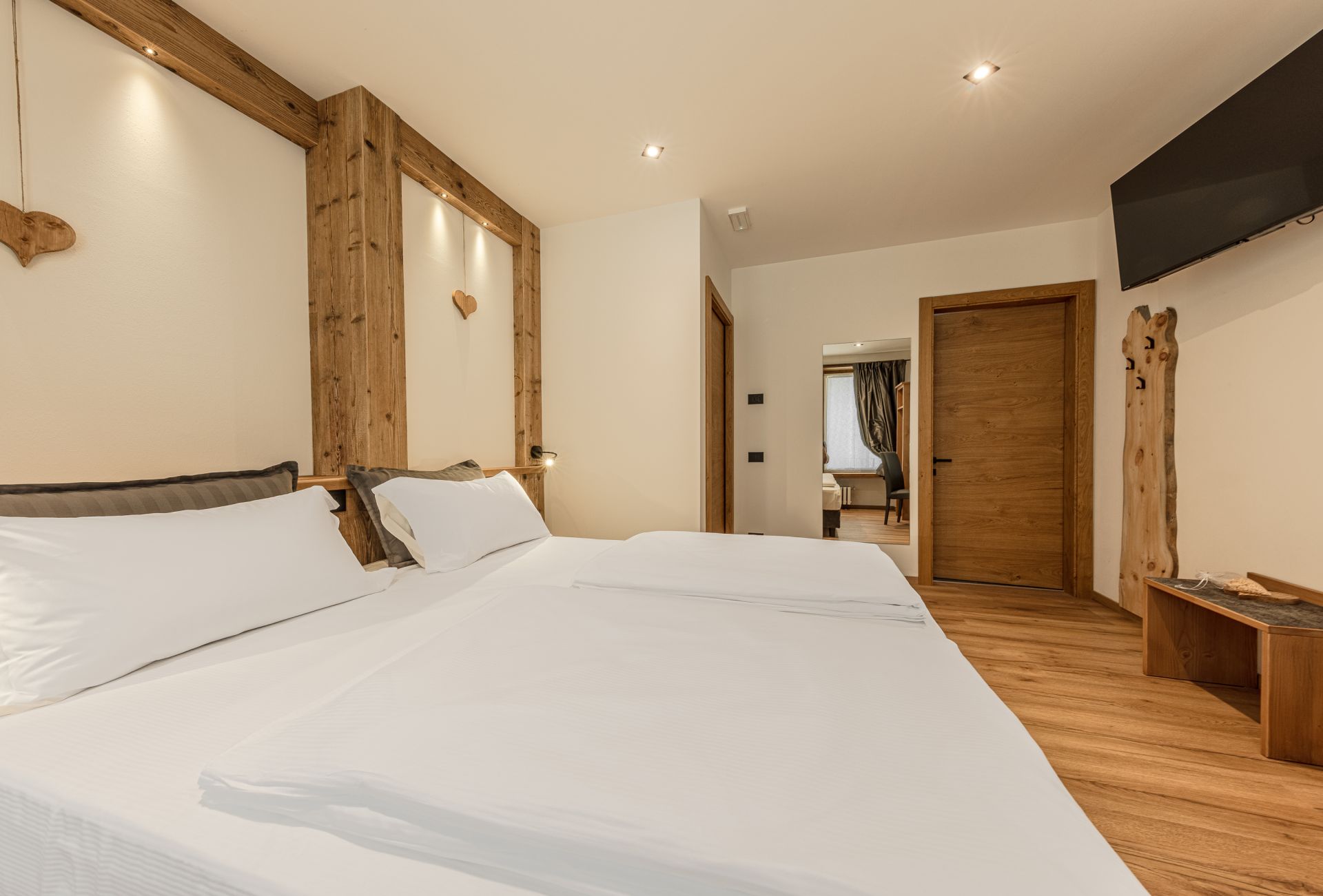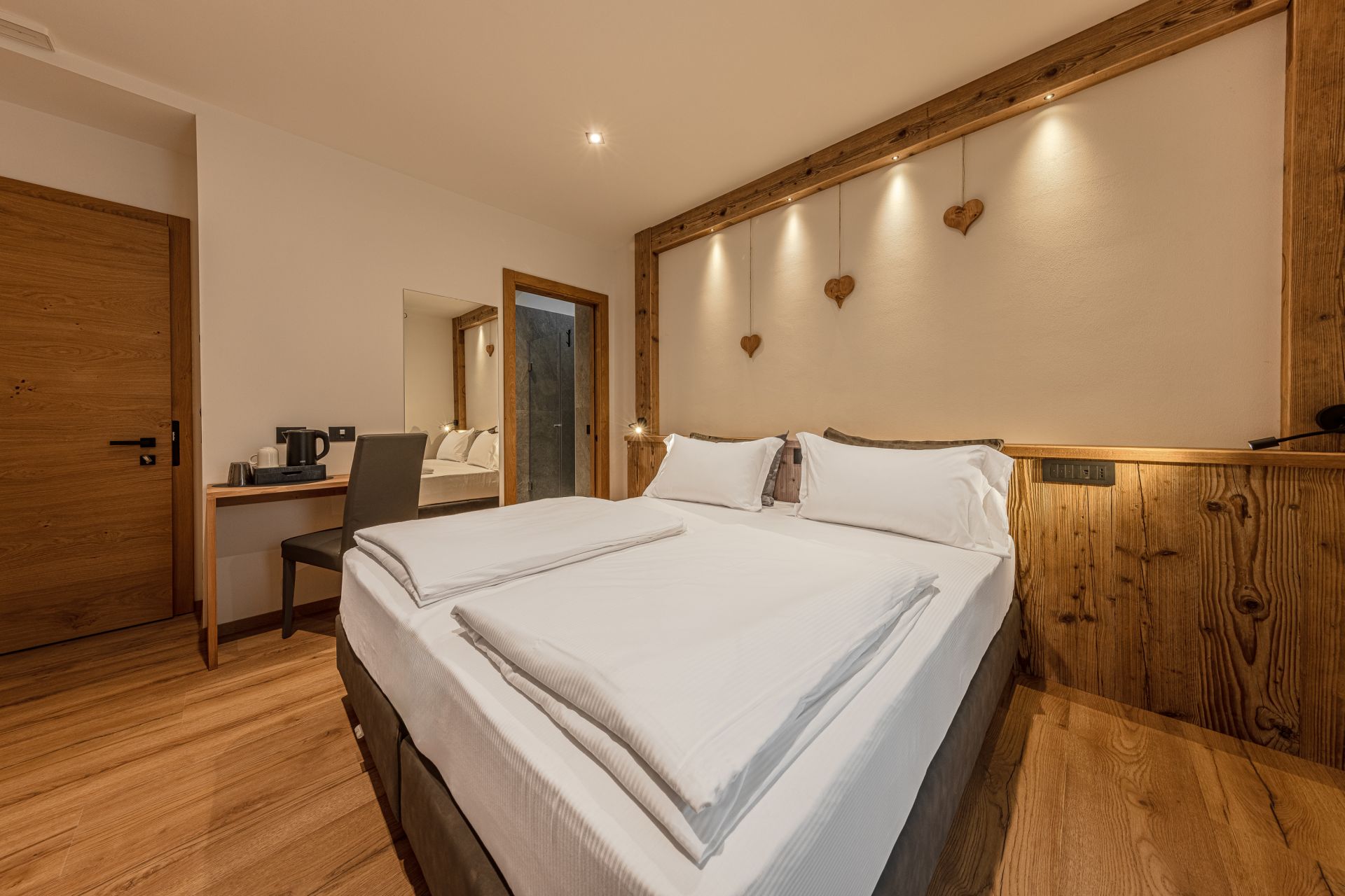 Le nostre camere sono dotate di tutti i comfort moderni, inclusi Smart TV, cassaforte e connessione Wi-Fi. Ogni camera è luminosa e spaziosa e dotata di bagno privato. In ogni stanza il nostro arredatore ha inserito un elemento di legno di cirmolo per infondere questa inebriante fragranza, dalle proprietà benefiche, in tutta la stanza. Tutte le camere si trovano al piano terra.